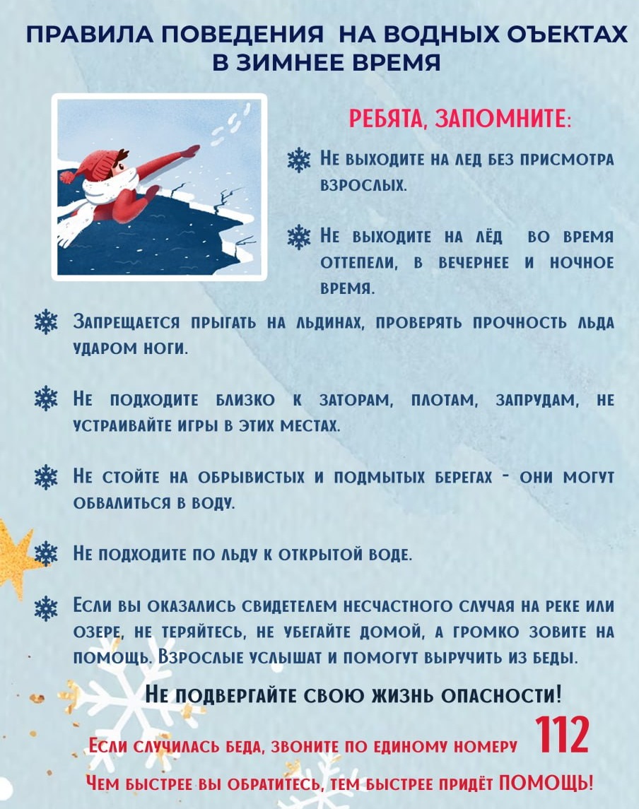 Не выходите на тонкий лед: он становится прочным только после длительных морозов. Родителям необходимо объяснить детям правила безопасности, запретить игры на льду и контролировать их нахождение у водоемов. Детям стоит знать, что делать при провале под лед: не паниковать, широко раскинуть руки, попытаться выбраться, ползти к берегу и звать на помощь, звоня по номеру 112. |