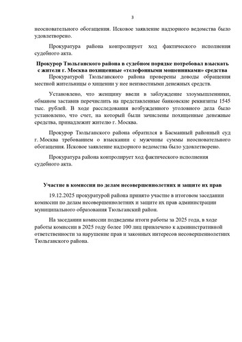 Прокуратурой района проведена проверка соблюдения требований жилищного и жилищно-коммунального хозяйства в деятельности управляющей компании ООО «Дом». По результатам проведенной проверки прокуратурой района выявлены факты ненадлежащей очистки придомовой территории ряда многоквартирных домов в п. Тюльган от снега, наледи и льда, несмотря на предшествующие обильные снегопады, работы по очистке пешеходных дорожек (тротуаров) от снега во дворах многоквартирных домов своевременно проведены не были, в пешеходных зонах выявлены снежные заносы. ... Читать дальше » |